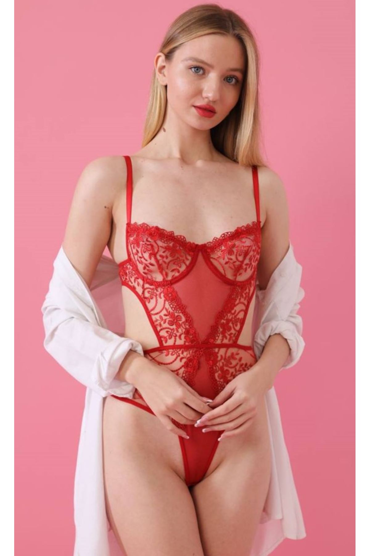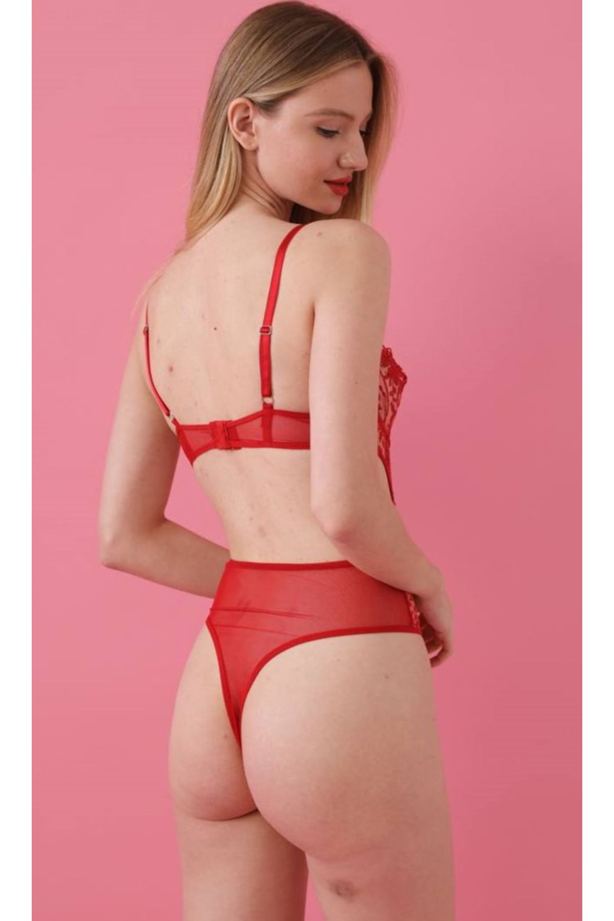 Kadın Kırmızı Transparan Dantel Detaylı Bodysuit Seksi Brode İç Çamaşırı