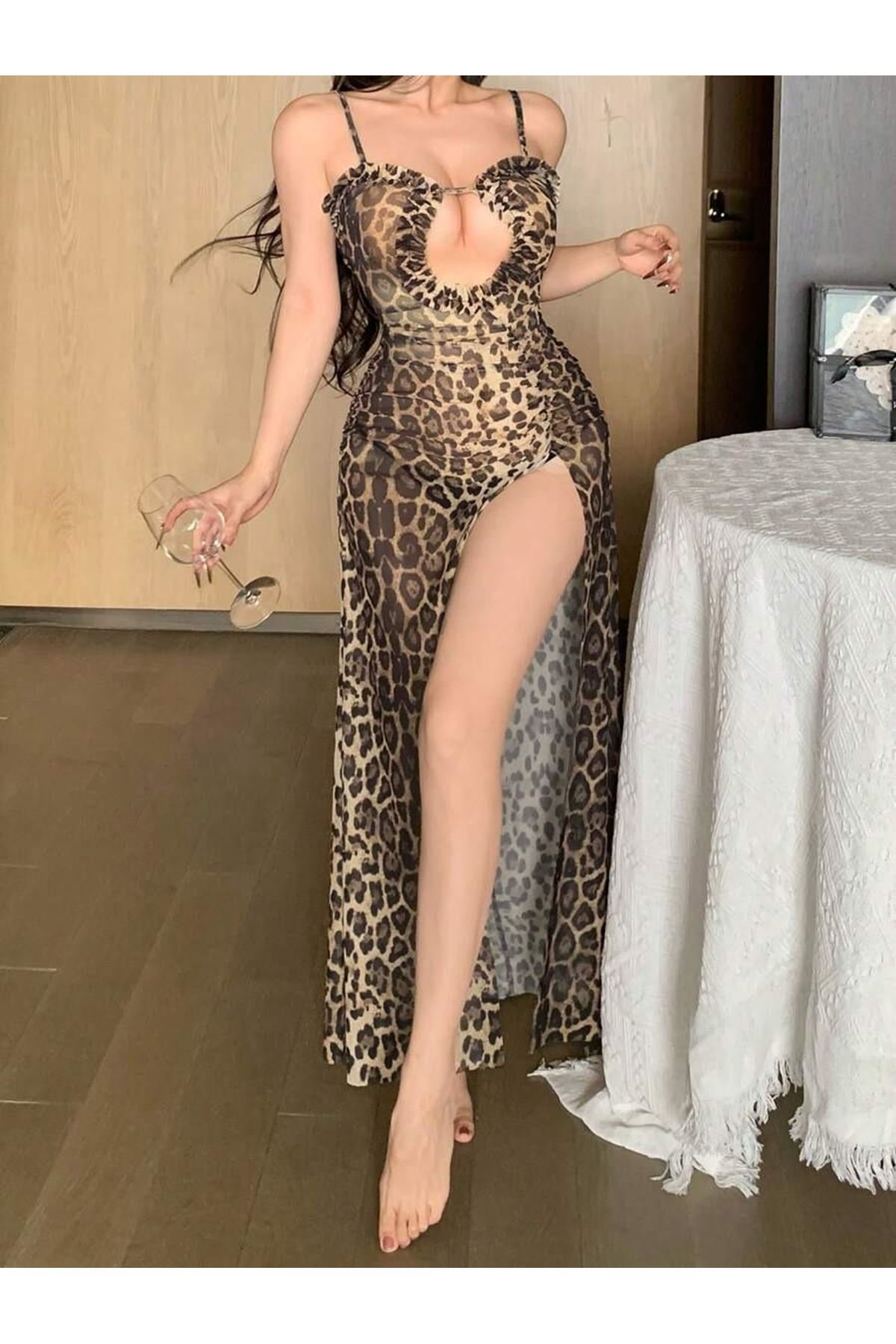 Leopar Likralı Transparan Gecelik Uzun Askılı Yırtmaçlı Yakası Fırfır Detaylı